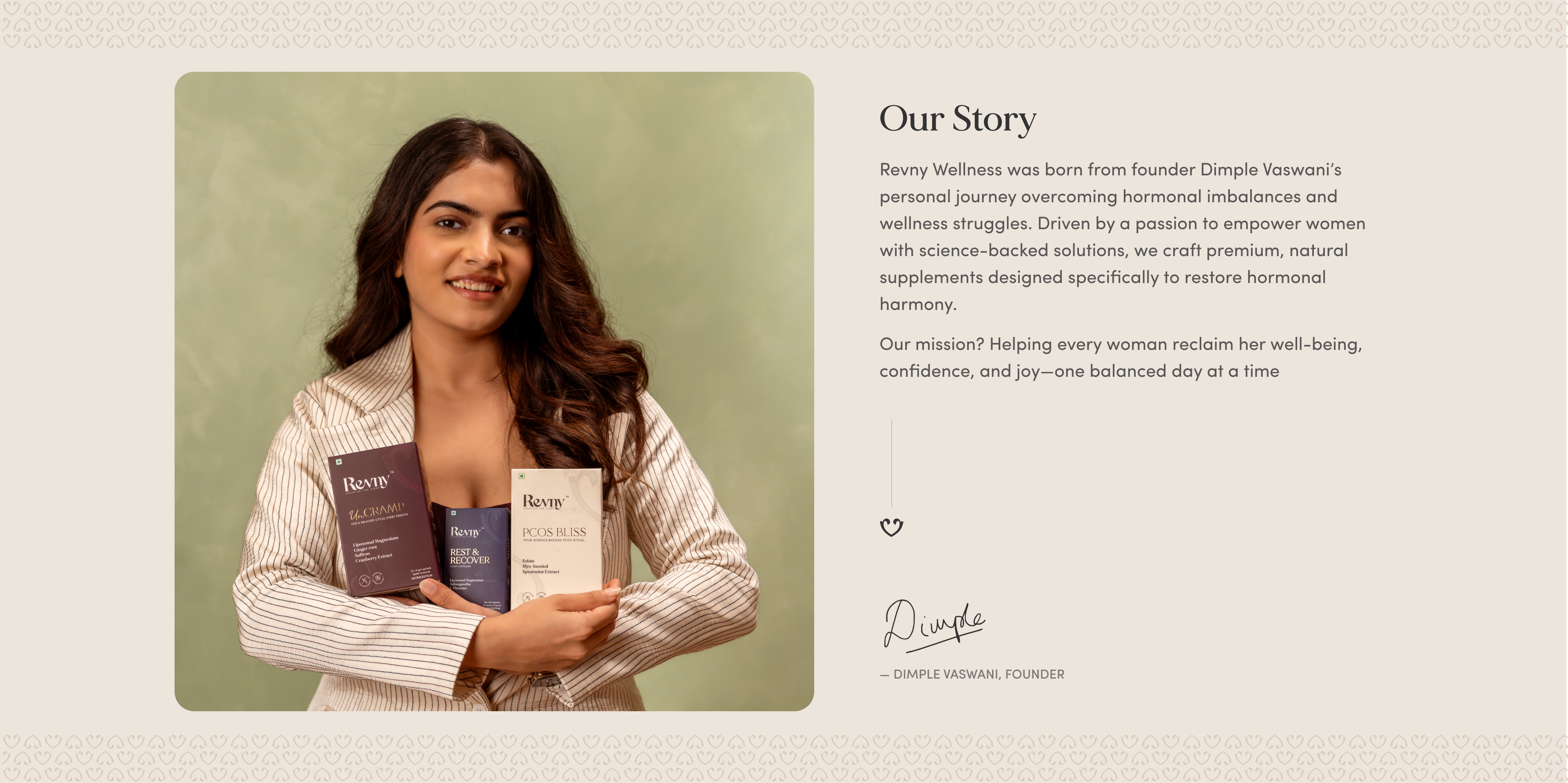 At Revny, we empower women through education-first wellness. Our clean, clinically-backed formulas support hormonal health using effective dosages—fostering confidence, clarity, and self-trust through holistic, high-quality care.