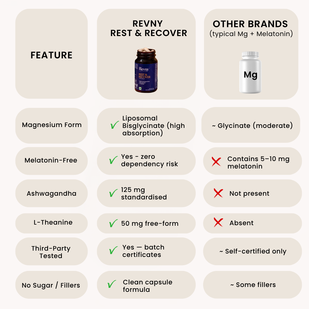 Unlike melatonin, Revny supports your body’s own sleep rhythms—so you wake up refreshed, not foggy or sluggish.